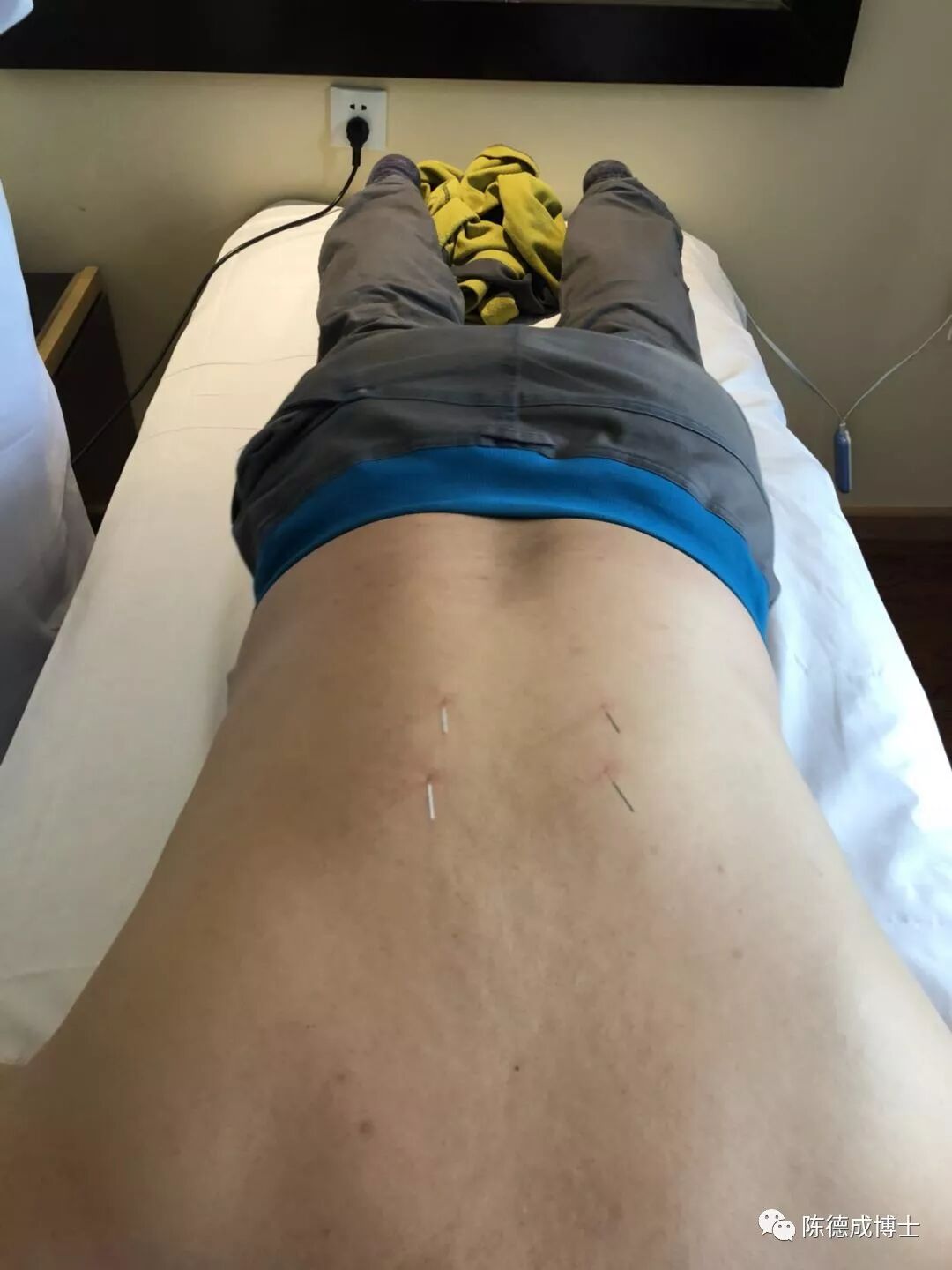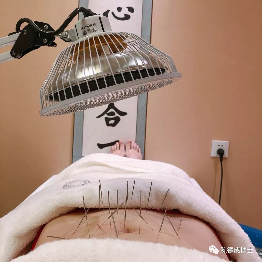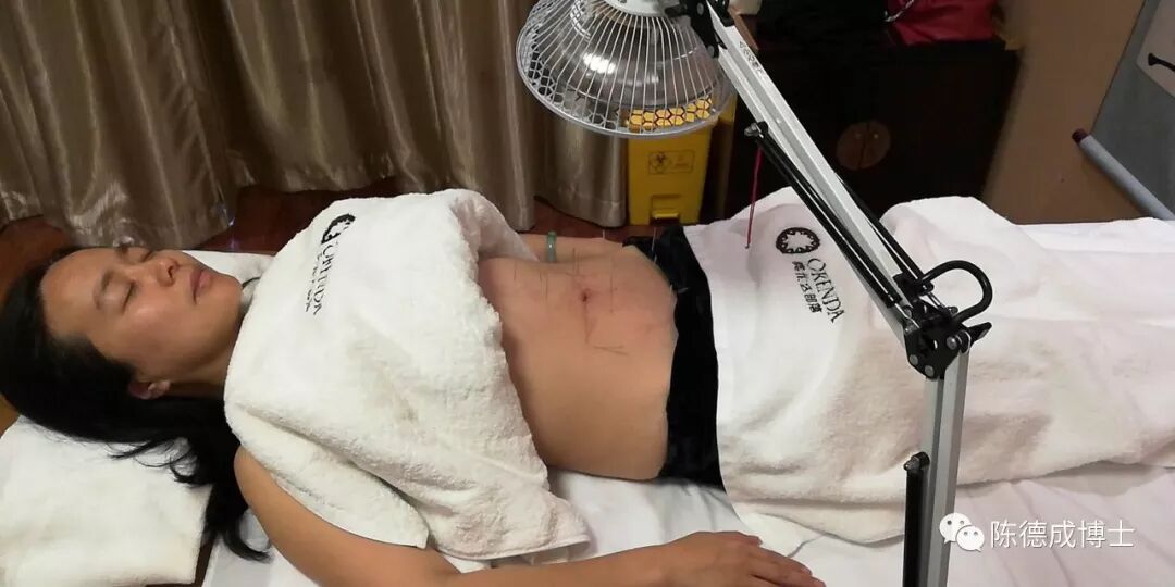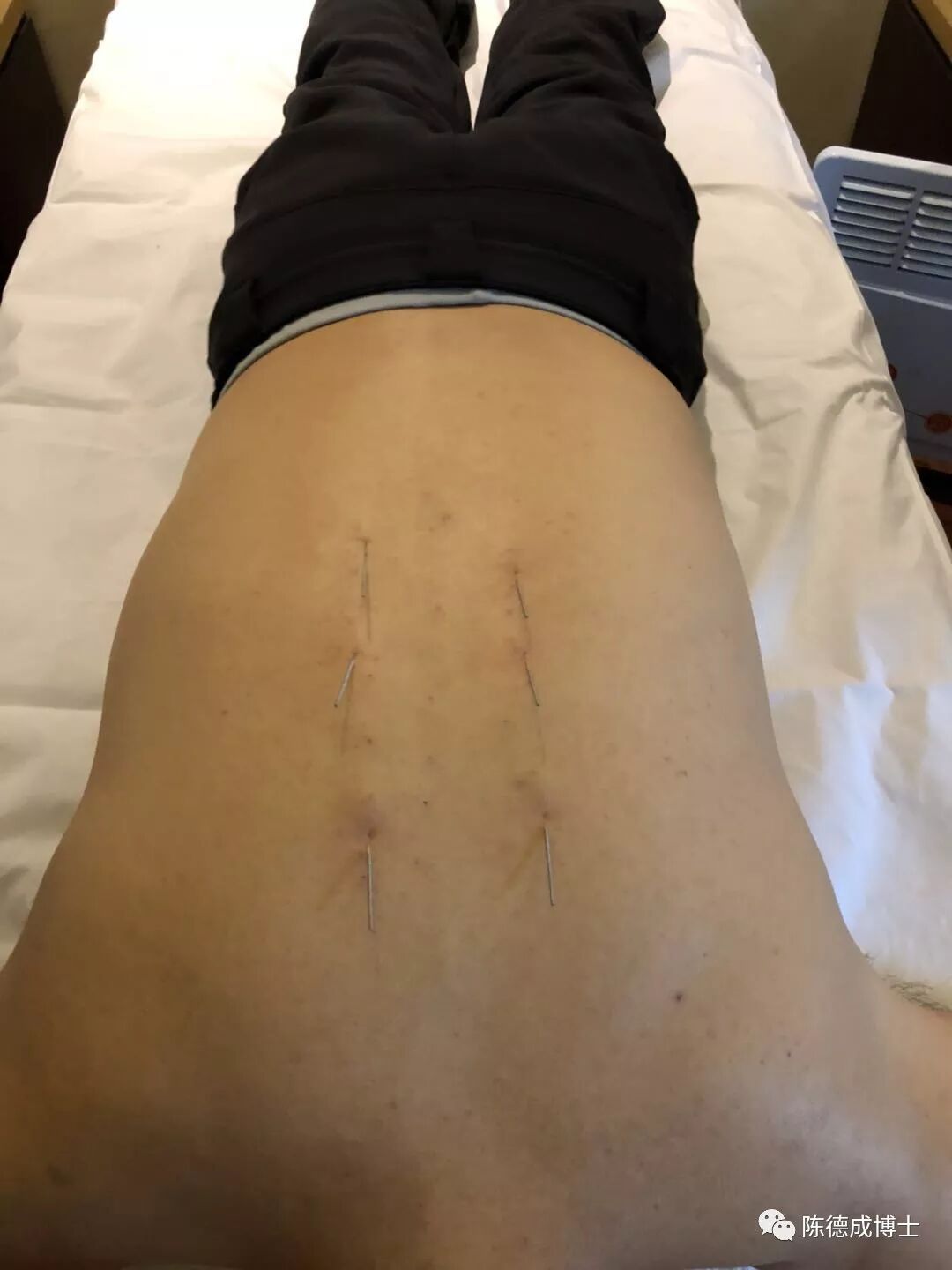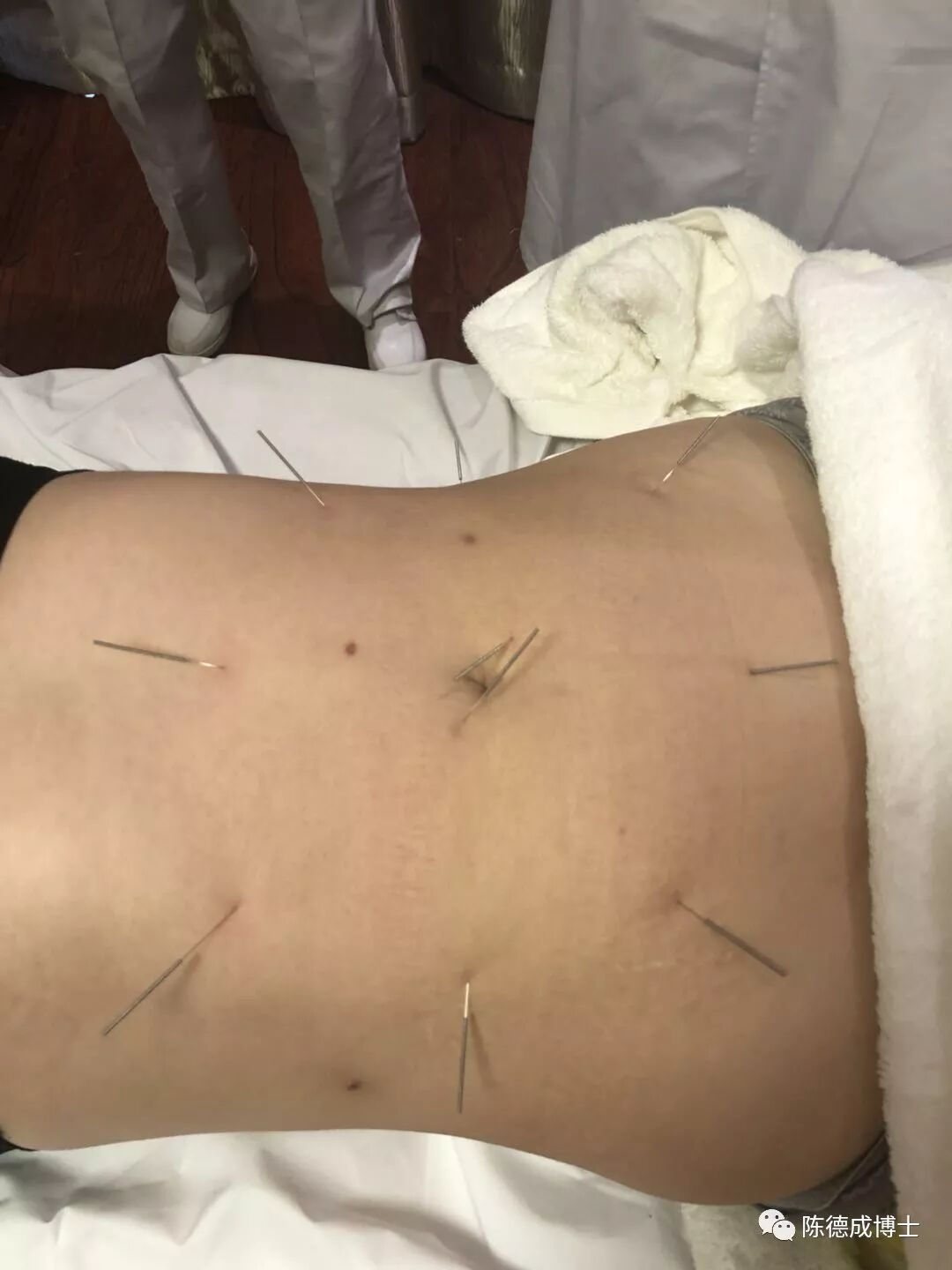 腹部十全大补针法,左一针,右一针……,左一针,右一针……,第七针时,针感直达会阴部。二十根针,进针完毕,配远红外线灯照射,留针三十分钟。留针三分钟时,腰部开始变热,热气上走于后背,下游于臀部。